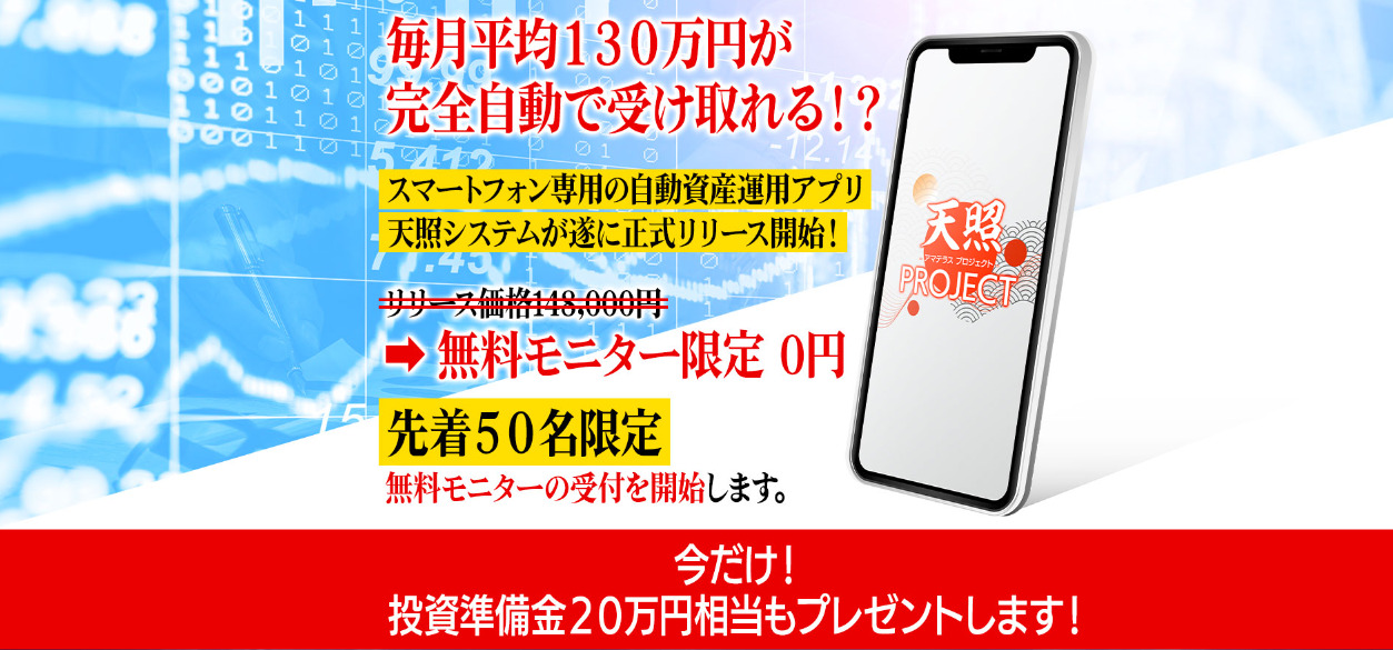 アマテラスプロジェクト(天照PROJECT)は「毎月130万円の不労所得」と「20万円の支援金」をすべての希望者に提供するという副業案件です。