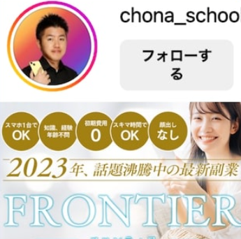 フロンティア(FRONTIER)という副業プログラムは、講師「ちょな」によるインスタグラムアフィリエイトで「誰でも簡単に月収300万円が目指せる」と謳っています。