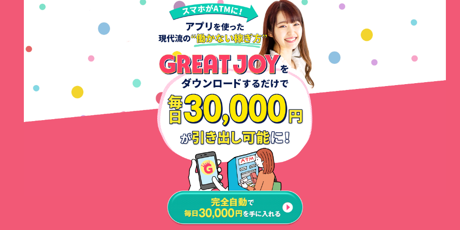 「グレイトジョイ(GREAT JOY)」という副業アプリの広告では、「何もしなくても自動で稼げる」と謳われ、手軽に月数十万円の収益を得られるような印象を与えています。