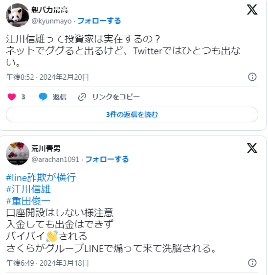 SNS上でも多くの被害報告があり、「江川信雄のLINEに参加して、全財産を失いました。取引はすべて操作されていたようで、最終的に資金を引き出すことができませんでした。LINEもブロックされ、連絡が取れない状況です。」という投稿が多く見受けられます。
