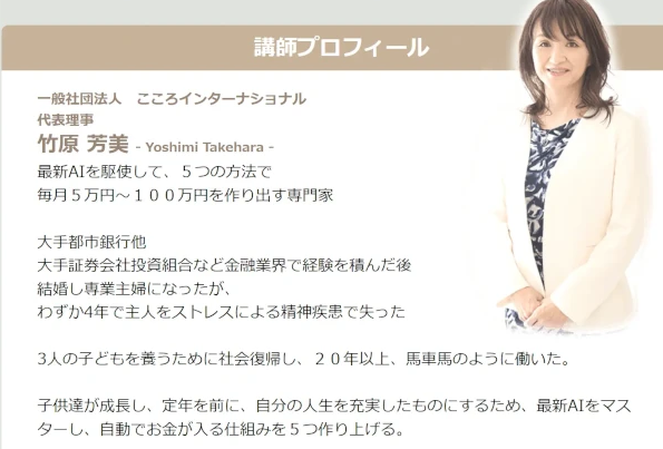 竹原芳美氏は「最新AI 5つの錬金術」の提案者として、以下の経歴が紹介されています: