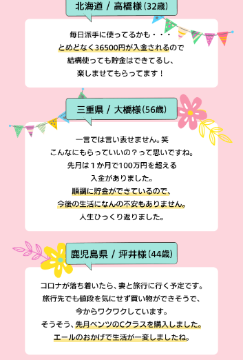 副業「エール」のサイト内には、いくつかの「利用者の声」が掲載されていますが、顔写真も名前も仮名で信ぴょう性に欠けます。