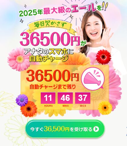 - 「毎日欠かさず36,500円があなたのスマホに自動チャージ」
